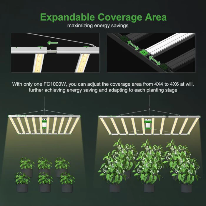 The Mars Hydro FC-1000W-BT LED Grow Light features a smart control system that allows for easy customization and expansion. The smart technology enables you to create an ideal lighting environment for optimal plant growth and maximize your indoor gardening success.